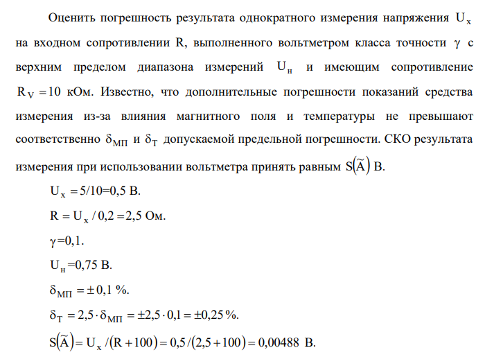Оценить погрешность результата однократного измерения напряжения Ux на входном сопротивлении R, выполненного вольтметром класса точности  с верхним пределом диапазона измерений Uн и имеющим сопротивление R V  10 кОм. Известно, что дополнительные погрешности показаний средства измерения из-за влияния магнитного поля и температуры не превышают соответственно МП и Т  допускаемой предельной погрешности. СКО результата измерения при использовании вольтметра принять равным