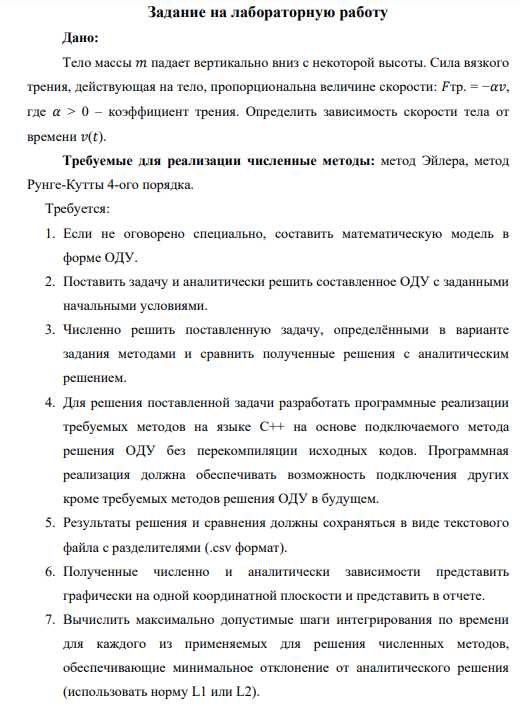 Дано: Тело массы падает вертикально вниз с некоторой высоты. Сила вязкого трения, действующая на тело, пропорциональна величине скорости: , где > 0 – коэффициент трения. Определить зависимость скорости тела от времени .