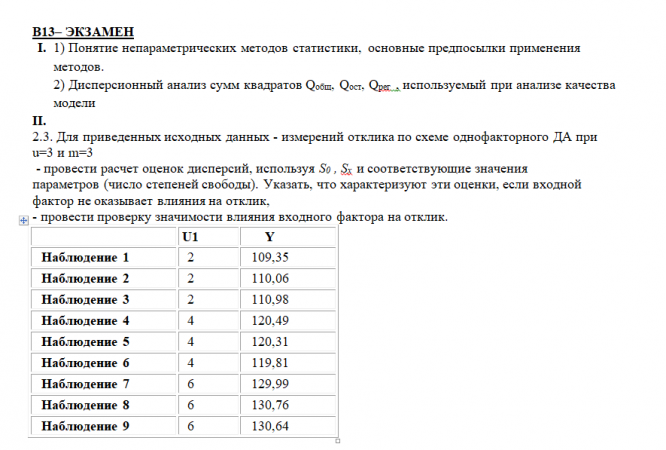 - провести расчет оценок дисперсий, используя S0 , Sxи соответствующие значения параметров (число степеней свободы). Указать, что характеризуют эти оценки, если входной фактор не оказывает влияния на отклик,