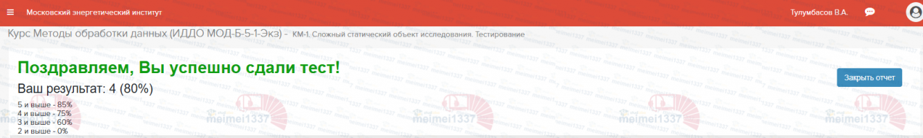 Для студентов ИДДО НИУ «МЭИ» по предмету Методы обработки данныхКурс Методы обработки данных - КМ-1. Сложный статический объект исследования. Тестирование - 80%Курс Методы обработки данных - КМ-1. Сложный статический объект исследования. Тестирование - 80%