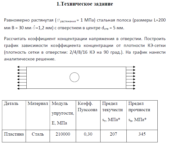 Для студентов МГТУ им. Н.Э.Баумана по предмету Методы оптимизации силовых конструкций транспортных средствДомашнее задание "Расчет стальной полосы с отверстием в центре на растяжение" (вариант №3)Домашнее задание "Расчет стальной полосы с отверстием в центре на растяжение" (вариант №3)