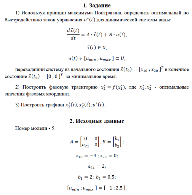 Для студентов МГТУ им. Н.Э.Баумана по предмету Методы оптимизации управления летательными аппаратамиДомашнее задание "Использование принципа максимума Понтрягина для оптимизации по быстродействию закона управления для динамической системы" (вариант №Домашнее задание "Использование принципа максимума Понтрягина для оптимизации по быстродействию закона управления для динамической системы" (вариант №