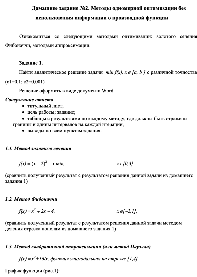 Главная » Учебные материалы » Методы оптимизации » Домашние задания » ИДДО НИУ «МЭИ» » 3 семестр » Номер 2 » Методы одномерной оптимизации без использования информации о производной функции