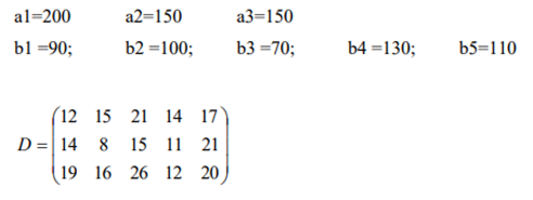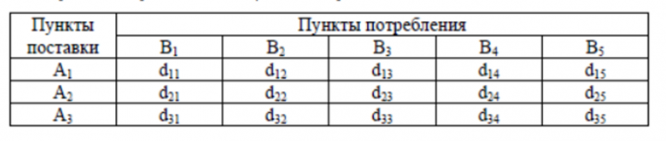 Имеются три пункта поставки однородного груза А1, А2, А3 и пять пунктов В1, В2, В3, В4, В5 потребления этого груза. На пунктах А1, А2 и А3 находится груз соответственно в количестве а1, а2 и а3 тонн. В пункты В1, В2, В3, В4, В5 требуется доставить соответственно b1, b2, b3, b4 и b5 тонн груза. Стоимость перевозки единицы груза от пункта поставки до пункта потребления приведена в следующей матрице – таблице: