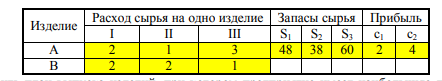 На предприятии имеется сырье видов I, II и III. Из него можно изготовить изделия типов A и B. Запасы сырья на предприятии составляют S1, S2 и S3 единиц соответственно. Изделие типа A дает прибыль c1 у.е., изделие типа B - c2 у.е. Расход сырья на изготовление одного изделия задан в условных единицах таблицей