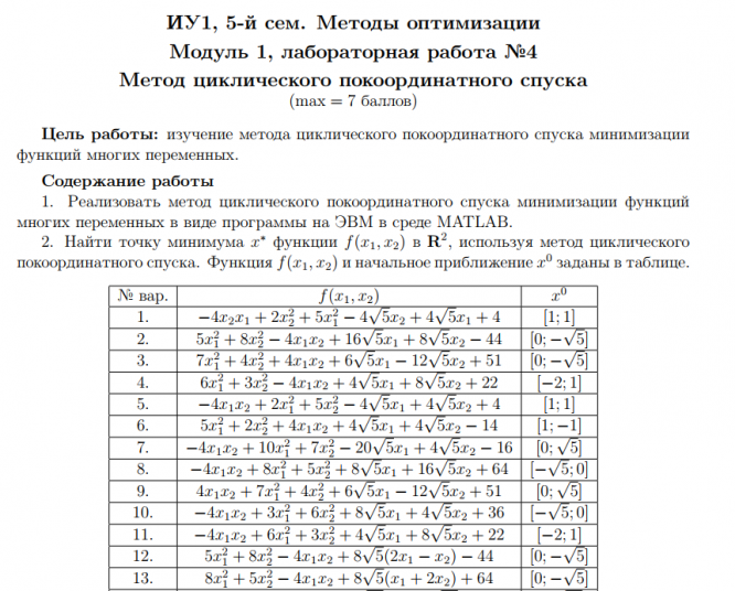 Для студентов МГТУ им. Н.Э.Баумана по предмету Методы оптимизацииМетод циклического покоординатного спуска ВариантМетод циклического покоординатного спуска Вариант