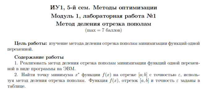 Для студентов МГТУ им. Н.Э.Баумана по предмету Методы оптимизацииМетод деления отрезка пополамМетод деления отрезка пополам