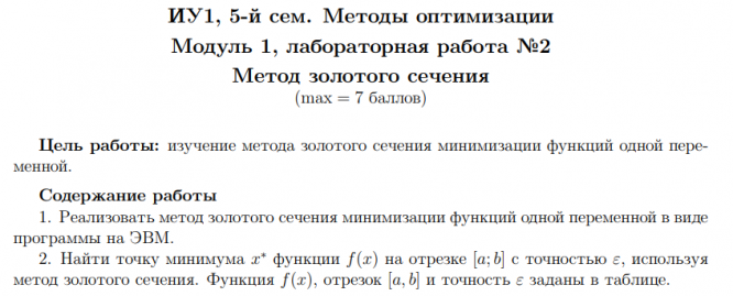 Для студентов МГТУ им. Н.Э.Баумана по предмету Методы оптимизацииМетод золотого сеченияМетод золотого сечения