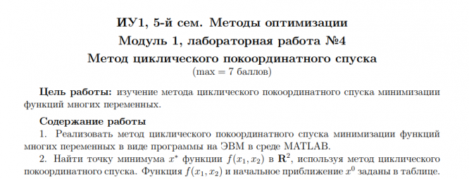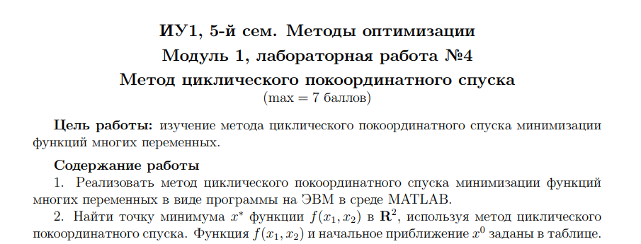 Лабораторная работа №4 по методам оптимизации "Метод циклического покоординатного спуска", 4 вариант.