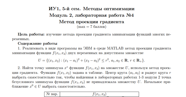Лабораторная работа №9.2 "Метод проекции антиградиента" по методам оптимизации, 4 вариант, работу принял Довбыш С.А. В документе ворд есть написанный код, просто матлабовский файл с этим кодом, к сожаления не сохранился, но вы можете скопировать код из ворда.
