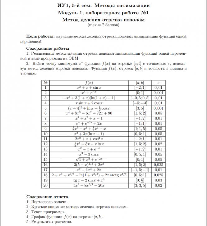 ЛР 1 Метод деления отрезка пополам. Вариант - 5. Преподаватель - Довбыш. Среда программирования - MATLAB. В файле представлен отчет с кодом программы. Цель работы: изучение метода деления отрезка пополам минимизации функций одной переменной. Содержание работы 1. Реализовать метод деления отрезка пополам минимизации функций одной переменной в виде программы на ЭВМ. 2. Найти точку минимума x ∗ функции f(x) на отрезке [a; b] с точностью ε, используя метод деления отрезка пополам. Функция f(x), отрезок [a, b] и точность ε заданы в таблице. ![]()