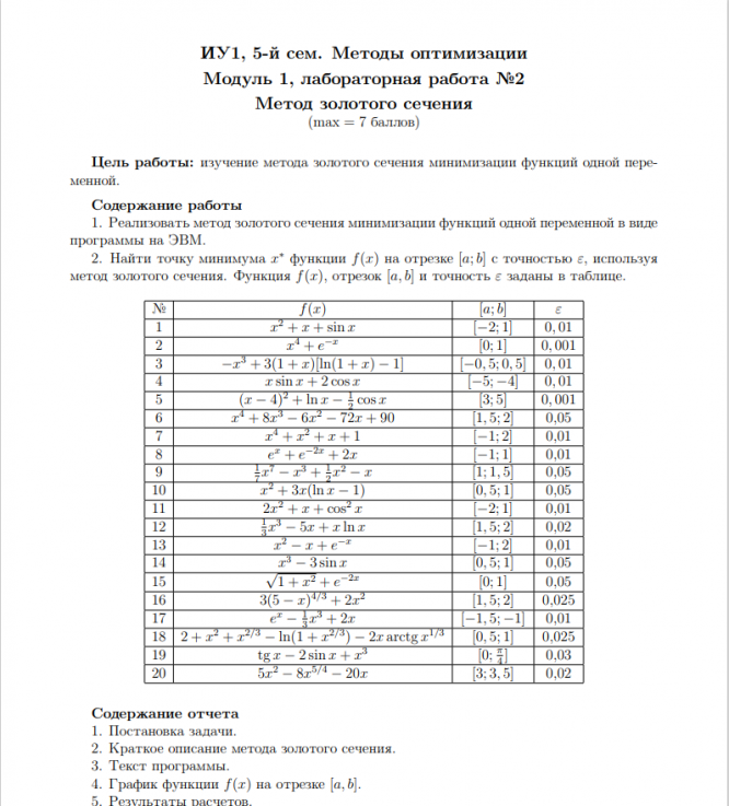 Для студентов МГТУ им. Н.Э.Баумана по предмету Методы оптимизацииЛабораторная работа 2: Метод золотого сечения вариант 5Лабораторная работа 2: Метод золотого сечения вариант 5
