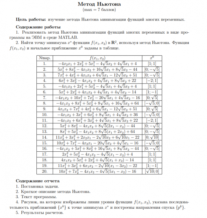 Цель работы: изучение метода Ньютона минимизации функций многих переменных. Содержание работы 1. Реализовать метод Ньютона минимизации функций многих переменных в виде программы на ЭВМ в среде MATLAB.
