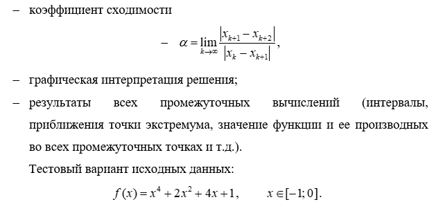 • результаты всех промежуточных вычислений (интервалы, приближения точки экстремума, значение функции и ее производных во всех промежуточных точках и т.д.).