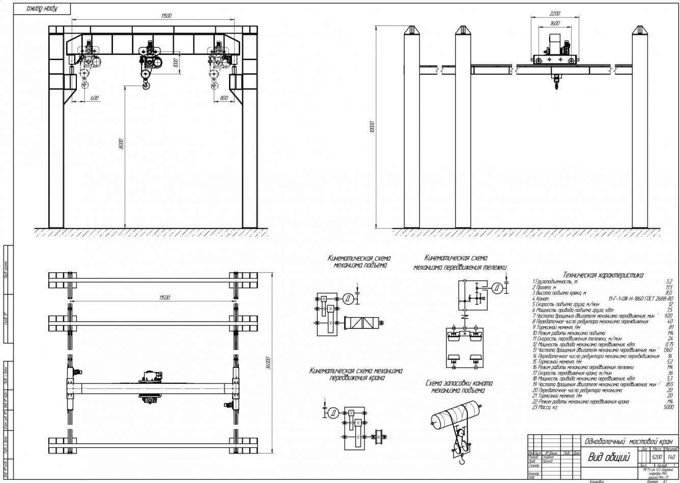 Для студентов МГТУ им. Н.Э.Баумана по предмету Методы расчета и проектирования наземных транспортно-технологических средствОднобалочный мостовой кран опорного типа: Q = 3,2 т, высота подъема 8 м, пролет 11,5 мОднобалочный мостовой кран опорного типа: Q = 3,2 т, высота подъема 8 м, пролет 11,5 м