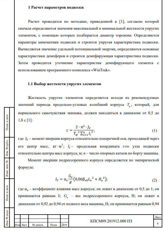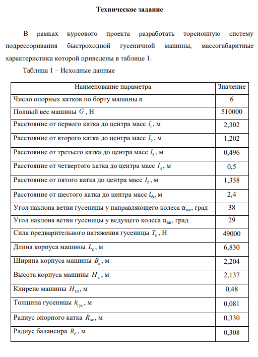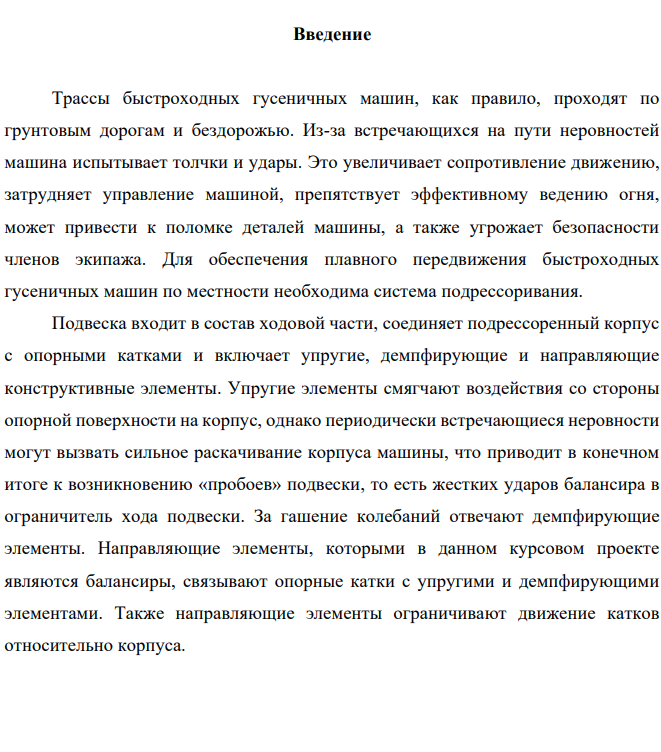 Трассы быстроходных гусеничных машин, как правило, проходят по грунтовым дорогам и бездорожью. Из-за встречающихся на пути неровностей машина испытывает толчки и удары. Это увеличивает сопротивление движению, затрудняет управление машиной, препятствует эффективному ведению огня, может привести к поломке деталей машины, а также угрожает безопасности членов экипажа. Для обеспечения плавного передвижения быстроходных гусеничных машин по местности необходима система подрессоривания. Подвеска входит в состав ходовой части, соединяет подрессоренный корпус с опорными катками и включает упругие, демпфирующие и направляющие конструктивные элементы. Упругие элементы смягчают воздействия со стороны опорной поверхности на корпус, однако периодически встречающиеся неровности могут вызвать сильное раскачивание корпуса машины, что приводит в конечном итоге к возникновению «пробоев» подвески, то есть жестких ударов балансира в ограничитель хода подвески. За гашение колебаний отвечают демпфирующие элементы. Направляющие элементы, которыми в данном курсовом проекте являются балансиры, связывают опорные катки с упругими и демпфирующими элементами. Также направляющие элементы ограничивают движение катков относительно корпуса