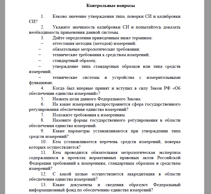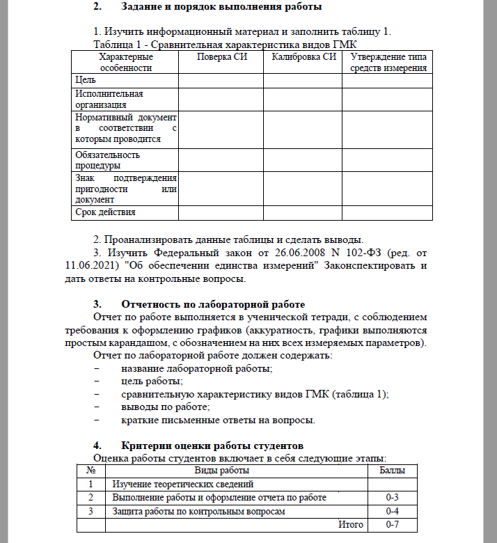 Показать/скрыть дополнительное описаниеТИУ; Государственный метрологический контрольПоверка СИ; Калибровка СИ; Утверждение типа средств измерения Цель; Исполнительная организация; Нормативный документ в соответствии с которым проводится Обязательность процедуры; Знак подтверждения пригодности или документ Срок действия Проанализировать данные таблицы и сделать выводы. Изучить Федеральный закон от 26.06.2008 N 102-ФЗ (ред. от 11.06.2021) "Об обеспечении единства измерений" Законспектировать и дать ответы на контрольные вопросы .