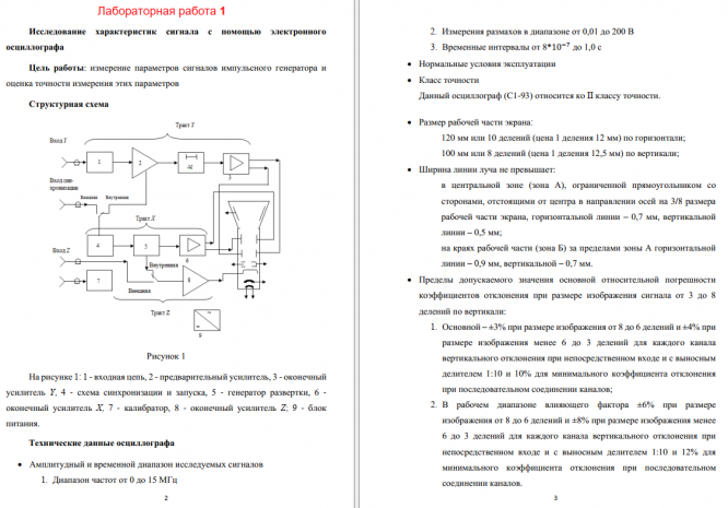 ЛР №1 по дисциплине Метрология и радиоизмерения, Исследование характеристик сигнала с помощью электронного осциллографа, Цель работы: измерение параметров сигналов импульсного генератора и оценка точности измерения этих параметров, Технические данные осциллографа • Амплитудный и временной диапазон исследуемых сигналов 1. Диапазон частот от 0 до 15 МГц 3 2. Измерения размахов в диапазоне от 0,01 до 200 В 3. Временные интервалы от 8* 10 -7 до 1,0 с • Нормальные условия эксплуатации • Класс точности Данный осциллограф (С1-93) относится ко II классу точности. • Размер рабочей части экрана: 120 мм или 10 делений (цена 1 деления 12 мм) по горизонтали; 100 мм или 8 делений (цена 1 деления 12,5 мм) по вертикали; • Ширина линии луча не превышает: в центральной зоне (зона А), ограниченной прямоугольником со сторонами, отстоящими от центра в направлении осей на 3/8 размера рабочей части экрана, горизонтальной линии – 0,7 мм, вертикальной линии – 0,5 мм; на краях рабочей части (зона Б) за пределами зоны А горизонтальной линии – 0,9 мм, вертикальной – 0,7 мм.