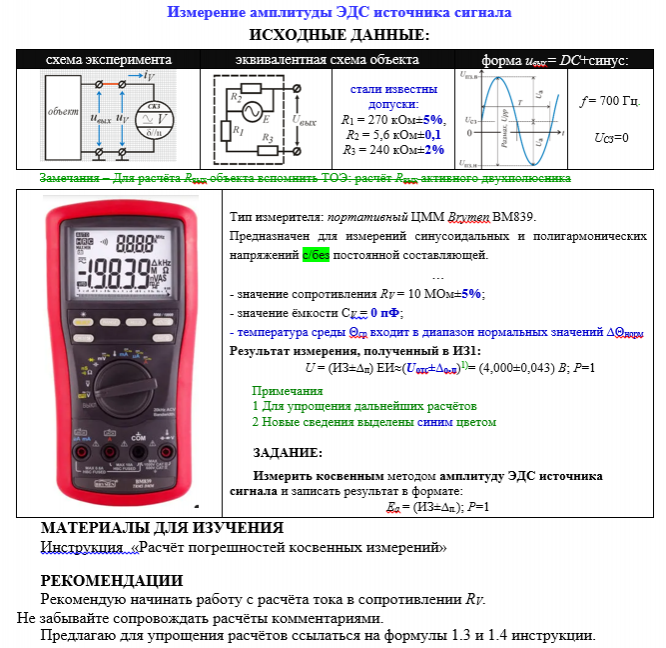 Для студентов ИДДО НИУ «МЭИ» по предмету Метрология и информационно-измерительная техникаТиповое задание по теме "Косвенные измерения". Контрольная работа "Измерение амплитуды ЭДС источника сигнала"Типовое задание по теме "Косвенные измерения". Контрольная работа "Измерение амплитуды ЭДС источника сигнала"