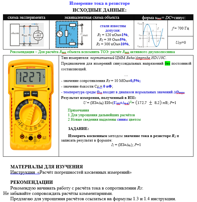Для студентов ИДДО НИУ «МЭИ» по предмету Метрология и информационно-измерительная техникаТиповое задание по теме "Косвенные измерения". Контрольная работа "Измерение тока, протекающего в резисторе"Типовое задание по теме "Косвенные измерения". Контрольная работа "Измерение тока, протекающего в резисторе"