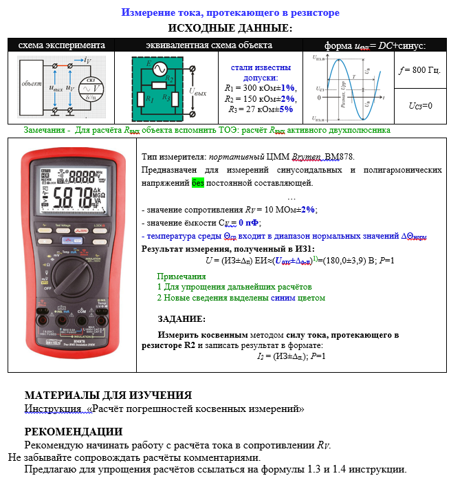 Для студентов ИДДО НИУ «МЭИ» по предмету Метрология и информационно-измерительная техникаТиповое задание по теме "Косвенные измерения". Контрольная работа "Измерение тока, протекающего в резисторе"Типовое задание по теме "Косвенные измерения". Контрольная работа "Измерение тока, протекающего в резисторе"