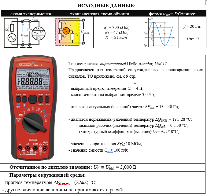 Предназначен для измерений синусоидальных и полигармонических сигналов. ТО приложено, см. с 9 стр. … - выбранный предел измерений Uк = 4 В; - класс точности на выбранном пределе 3,0 // 5;   - диапазон актуальных (значений) частот ∆Fакт. = 15…40 Гц;   - диапазон нормальных (значений) температур ∆Θнорм. = 18…28 °С;                 - диапазон рабочих (значений) температур ∆Θраб. = 0…50 °С;                 - температурный коэффициент (влияния) kΘ = ∆о.п./10°С;   - значение сопротивления RV≥ 10 МОм; - значение ёмкости СV  ≤ 100 пФ; Отсчитанное по дисплею значение: UV.ºUотс. = 3,000 B Параметры окружающей среды: - прогноз температуры ∆Θсреды = (22±2) °С; - другие влияющие величины не принимаются в расчёт. .