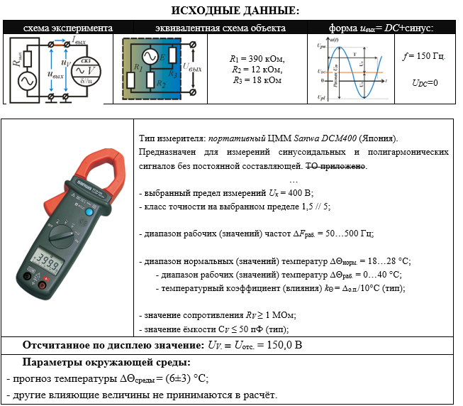ИСХОДНЫЕ ДАННЫЕ: схема экспериментаэквивалентная схема объектаформа uвых= DC+синус: R1 = 390 кОм, R2 = 12 кОм, R3 = 18 кОм f = 150 Гц. UDC=0 Тип измерителя: портативный ЦММ Sanwa DCM400 (Япония). Предназначен для измерений синусоидальных и полигармонических сигналов без постоянной составляющей. ТО приложено. … - выбранный предел измерений Uк = 400 В; - класс точности на выбранном пределе 1,5 // 5; - диапазон рабочих (значений) частот ∆Fраб. = 50…500 Гц; - диапазон нормальных (значений) температур ∆Θнорм. = 18…28 °С; - диапазон рабочих (значений) температур ∆Θраб. = 0…40 °С; - температурный коэффициент (влияния) kΘ = ∆о.п./10°С (тип); - значение сопротивления RV ≥ 1 МОм; - значение ёмкости СV ≤ 50 пФ (тип); Отсчитанное по дисплею значение: UV.
