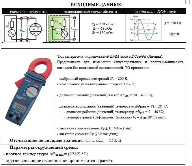 ИСХОДНЫЕ ДАННЫЕ: схема экспериментаэквивалентная схема объектаформа uвых= DC+синус: R1 = 620 кОм, R2 = 75 кОм, R3 = 91 кОм f = 60 Гц. UDC=0 Тип измерителя: портативный ЦММ Brymen BM 037. Предназначен для измерений синусоидальных и полигармонических сигналов. ТО приложено. … - выбранный предел измерений Uк = 600 В; - класс точности на выбранном пределе 1,5 // 5; - диапазон рабочих (значений) частот ∆Fраб. = 50…60 Гц; - диапазон нормальных (значений) температур ∆Θнорм. = 18…28 °С; - диапазон рабочих (значений) температур ∆Θраб. = 0…40 °С; - температурный коэффициент (влияния) kΘ = ∆о.п./10°С; - значение сопротивления RV ≥ 10 МОм; - значение ёмкости СV ≤ 100 пФ; Отсчитанное по дисплею значение: UV.