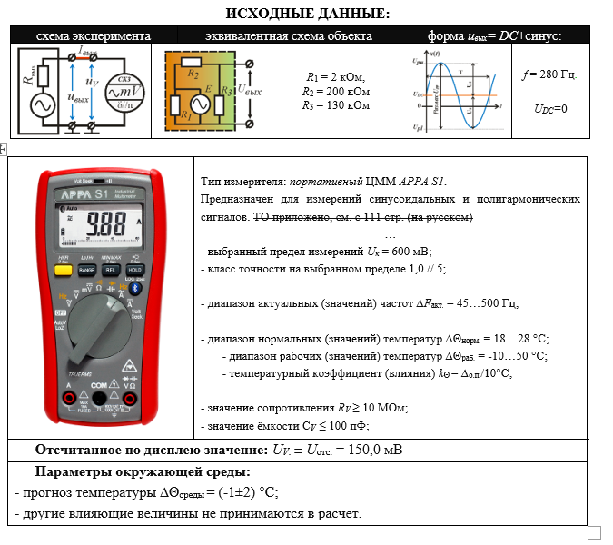 ИСХОДНЫЕ ДАННЫЕ: схема экспериментаэквивалентная схема объектаформа uвых= DC+синус: R1 = 2 кОм, R2 = 200 кОм R3 = 130 кОм f = 280 Гц. UDC=0 Тип измерителя: портативный ЦММ APPA S1. Предназначен для измерений синусоидальных и полигармонических сигналов. ТО приложено, см. с 111 стр. (на русском) … - выбранный предел измерений Uк = 600 мВ; - класс точности на выбранном пределе 1,0 // 5; - диапазон актуальных (значений) частот ∆Fакт. = 45…500 Гц; - диапазон нормальных (значений) температур ∆Θнорм. = 18…28 °С; - диапазон рабочих (значений) температур ∆Θраб. = -10…50 °С; - температурный коэффициент (влияния) kΘ = ∆о.п./10°С; - значение сопротивления RV ≥ 10 МОм; - значение ёмкости СV ≤ 100 пФ; Отсчитанное по дисплею значение: UV.