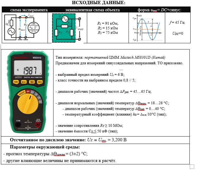 ИСХОДНЫЕ ДАННЫЕ: схема экспериментаэквивалентная схема объектаформа uвых= DC+синус: R1 = 91 кОм, R2 = 15 кОм R3 = 75 кОм f = 45 Гц. UDC=0 Тип измерителя: портативный ЦММ Mastech MS8301D (Китай) Предназначен для измерений синусоидальных напряжений. ТО приложено. … - выбранный предел измерений Uк = 6 В; - класс точности на выбранном пределе 0,8 // 5; - диапазон рабочих (значений) частот ∆Fраб. = 45…65 Гц; - диапазон нормальных (значений) температур ∆Θнорм. = 18…28 °С; - диапазон рабочих (значений) температур ∆Θраб. = 0…40 °С; - температурный коэффициент (влияния) kΘ = ∆о.п./10°С (тип); - значение сопротивления RV ≥ 10 МОм; - значение ёмкости СV ≤ 50 пФ (тип); Отсчитанное по дисплею значение: UV.