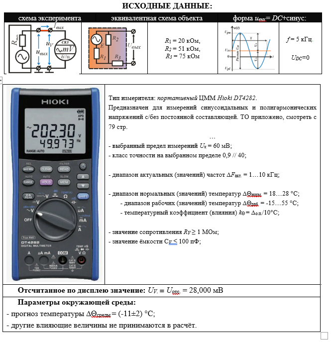 ИСХОДНЫЕ ДАННЫЕ: схема экспериментаэквивалентная схема объектаформа uвых= DC+синус: R1 = 20 кОм, R2 = 51 кОм, R3 = 75 кОм f = 5 кГц. UDC=0 Тип измерителя: портативный ЦММ Hioki DT4282. Предназначен для измерений синусоидальных и полигармонических напряжений с/без постоянной составляющей. ТО приложено, смотреть с 79 стр. … - выбранный предел измерений Uк = 60 мВ; - класс точности на выбранном пределе 0,9 // 40; - диапазон актуальных (значений) частот ∆Fакт. = 1…10 кГц; - диапазон нормальных (значений) температур ∆Θнорм. = 18…28 °С; - диапазон рабочих (значений) температур ∆Θраб. = -15…55 °С; - температурный коэффициент (влияния) kΘ = ∆о.п./10°С; - значение сопротивления RV ≥ 1 МОм; - значение ёмкости СV ≤ 100 пФ; Отсчитанное по дисплею значение: UV.