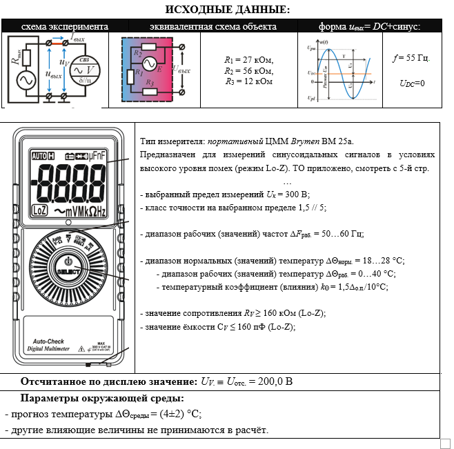 ИСХОДНЫЕ ДАННЫЕ: схема экспериментаэквивалентная схема объектаформа uвых= DC+синус: R1 = 27 кОм, R2 = 56 кОм, R3 = 12 кОм f = 55 Гц. UDC=0 Тип измерителя: портативный ЦММ Brymen BM 25a. Предназначен для измерений синусоидальных сигналов в условиях высокого уровня помех (режим Lo-Z). ТО приложено, смотреть с 5-й стр. … - выбранный предел измерений Uк = 300 В; - класс точности на выбранном пределе 1,5 // 5; - диапазон рабочих (значений) частот ∆Fраб. = 50…60 Гц; - диапазон нормальных (значений) температур ∆Θнорм. = 18…28 °С; - диапазон рабочих (значений) температур ∆Θраб. = 0…40 °С; - температурный коэффициент (влияния) kΘ = 1,5∆о.п./10°С; - значение сопротивления RV ≥ 160 кОм (Lo-Z); - значение ёмкости СV ≤ 160 пФ (Lo-Z); Отсчитанное по дисплею значение: UV.