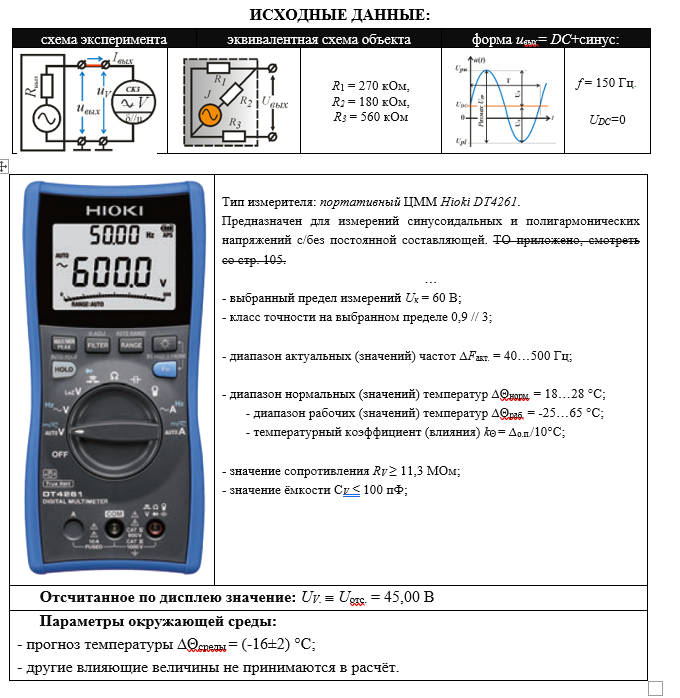 ИСХОДНЫЕ ДАННЫЕ: схема экспериментаэквивалентная схема объектаформа uвых= DC+синус: R1 = 270 кОм, R2 = 180 кОм, R3 = 560 кОм f = 150 Гц. UDC=0 Тип измерителя: портативный ЦММ Hioki DT4261. Предназначен для измерений синусоидальных и полигармонических напряжений с/без постоянной составляющей. ТО приложено, смотреть со стр. 105. … - выбранный предел измерений Uк = 60 В; - класс точности на выбранном пределе 0,9 // 3; - диапазон актуальных (значений) частот ∆Fакт. = 40…500 Гц; - диапазон нормальных (значений) температур ∆Θнорм. = 18…28 °С; - диапазон рабочих (значений) температур ∆Θраб. = -25…65 °С; - температурный коэффициент (влияния) kΘ = ∆о.п./10°С; - значение сопротивления RV ≥ 11,3 МОм; - значение ёмкости СV ≤ 100 пФ; Отсчитанное по дисплею значение: UV.