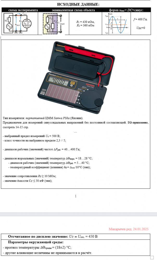 ИСХОДНЫЕ ДАННЫЕ: схема экспериментаэквивалентная схема объектаформа uвых= DC+синус: R1 = 430 кОм, R2 = 360 кОм f = 400 Гц. UDC=0 Тип измерителя: портативный ЦММ Sanwa PS8a (Япония). Предназначен для измерений синусоидальных напряжений без постоянной составляющей. ТО приложено, смотреть 14-15 стр. … - выбранный предел измерений Uк = 500 В; - класс точности на выбранном пределе 2,3 // 5; - диапазон рабочих (значений) частот ∆Fраб. = 40…400 Гц; - диапазон нормальных (значений) температур ∆Θнорм. = 18…28 °С; - диапазон рабочих (значений) температур ∆Θраб. = 5…40 °С; - температурный коэффициент (влияния) kΘ = ∆о.п./10°С (тип); - значение сопротивления RV ≥ 10 МОм; - значение ёмкости СV ≤ 50 пФ (тип); Отсчитанное по дисплею значение: UV.