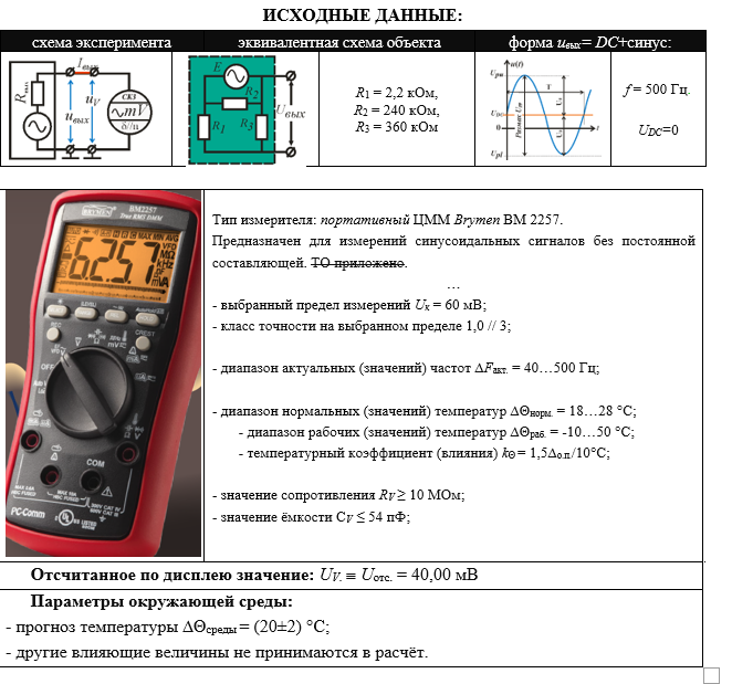 ИСХОДНЫЕ ДАННЫЕ: схема экспериментаэквивалентная схема объектаформа uвых= DC+синус: R1 = 2,2 кОм, R2 = 240 кОм, R3 = 360 кОм f = 500 Гц. UDC=0 Тип измерителя: портативный ЦММ Brymen BM 2257. Предназначен для измерений синусоидальных сигналов без постоянной составляющей. ТО приложено. … - выбранный предел измерений Uк = 60 мВ; - класс точности на выбранном пределе 1,0 // 3; - диапазон актуальных (значений) частот ∆Fакт. = 40…500 Гц; - диапазон нормальных (значений) температур ∆Θнорм. = 18…28 °С; - диапазон рабочих (значений) температур ∆Θраб. = -10…50 °С; - температурный коэффициент (влияния) kΘ = 1,5∆о.п./10°С; - значение сопротивления RV ≥ 10 МОм; - значение ёмкости СV ≤ 54 пФ; Отсчитанное по дисплею значение: UV.