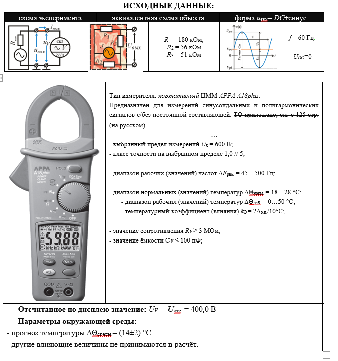 ИСХОДНЫЕ ДАННЫЕ: схема экспериментаэквивалентная схема объектаформа uвых= DC+синус: R1 = 180 кОм, R2 = 56 кОм R3 = 51 кОм f = 60 Гц. UDC=0 Тип измерителя: портативный ЦММ APPA A18plus. Предназначен для измерений синусоидальных и полигармонических сигналов с/без постоянной составляющей. ТО приложено, см. с 125 стр. (на русском) … - выбранный предел измерений Uк = 600 В; - класс точности на выбранном пределе 1,0 // 5; - диапазон рабочих (значений) частот ∆Fраб. = 45…500 Гц; - диапазон нормальных (значений) температур ∆Θнорм. = 18…28 °С; - диапазон рабочих (значений) температур ∆Θраб. = 0…50 °С; - температурный коэффициент (влияния) kΘ = 2∆о.п./10°С; - значение сопротивления RV ≥ 3 МОм; - значение ёмкости СV ≤ 100 пФ; Отсчитанное по дисплею значение: UV.