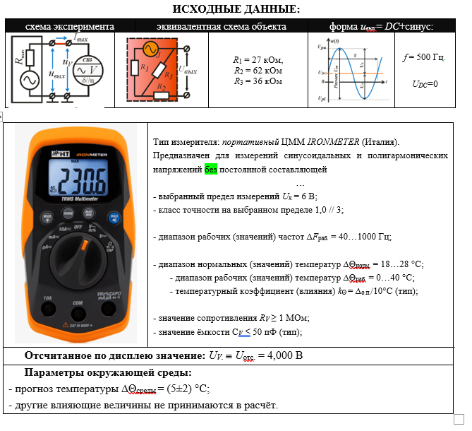 ИСХОДНЫЕ ДАННЫЕ: схема экспериментаэквивалентная схема объектаформа uвых= DC+синус: R1 = 27 кОм, R2 = 62 кОм R3 = 36 кОм f = 500 Гц. UDC=0 Тип измерителя: портативный ЦММ IRONMETER (Италия). Предназначен для измерений синусоидальных и полигармонических напряжений без постоянной составляющей … - выбранный предел измерений Uк = 6 В; - класс точности на выбранном пределе 1,0 // 3; - диапазон рабочих (значений) частот ∆Fраб. = 40…1000 Гц; - диапазон нормальных (значений) температур ∆Θнорм. = 18…28 °С; - диапазон рабочих (значений) температур ∆Θраб. = 0…40 °С; - температурный коэффициент (влияния) kΘ = ∆о.п./10°С (тип); - значение сопротивления RV ≥ 1 МОм; - значение ёмкости СV ≤ 50 пФ (тип); Отсчитанное по дисплею значение: UV.