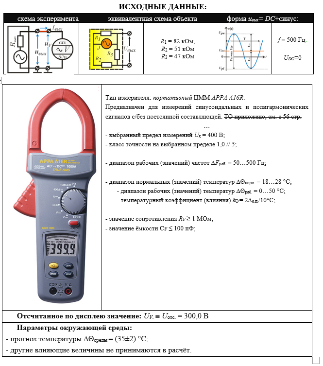 ИСХОДНЫЕ ДАННЫЕ: схема экспериментаэквивалентная схема объектаформа uвых= DC+синус: R1 = 82 кОм, R2 = 51 кОм R3 = 47 кОм f = 500 Гц. UDC=0 Тип измерителя: портативный ЦММ APPA A16R. Предназначен для измерений синусоидальных и полигармонических сигналов с/без постоянной составляющей. ТО приложено, см. с 56 стр. … - выбранный предел измерений Uк = 400 В; - класс точности на выбранном пределе 1,0 // 5; - диапазон рабочих (значений) частот ∆Fраб. = 50…500 Гц; - диапазон нормальных (значений) температур ∆Θнорм. = 18…28 °С; - диапазон рабочих (значений) температур ∆Θраб. = 0…50 °С; - температурный коэффициент (влияния) kΘ = 2∆о.п./10°С; - значение сопротивления RV ≥ 1 МОм; - значение ёмкости СV ≤ 100 пФ; Отсчитанное по дисплею значение: UV.