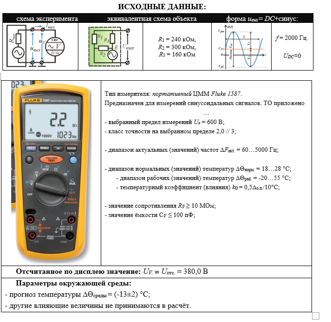 ИСХОДНЫЕ ДАННЫЕ: схема экспериментаэквивалентная схема объектаформа uвых= DC+синус: R1 = 240 кОм, R2 = 300 кОм, R3 = 160 кОм f = 2000 Гц. UDC=0 Тип измерителя: портативный ЦММ Fluke 1587. Предназначен для измерений синусоидальных сигналов. ТО приложено … - выбранный предел измерений Uк = 600 В; - класс точности на выбранном пределе 2,0 // 3; - диапазон актуальных (значений) частот ∆Fакт. = 60…5000 Гц; - диапазон нормальных (значений) температур ∆Θнорм. = 18…28 °С; - диапазон рабочих (значений) температур ∆Θраб. = -20…55 °С; - температурный коэффициент (влияния) kΘ = 0,5∆о.п./10°С; - значение сопротивления RV ≥ 10 МОм; - значение ёмкости СV ≤ 100 пФ; Отсчитанное по дисплею значение: UV.
