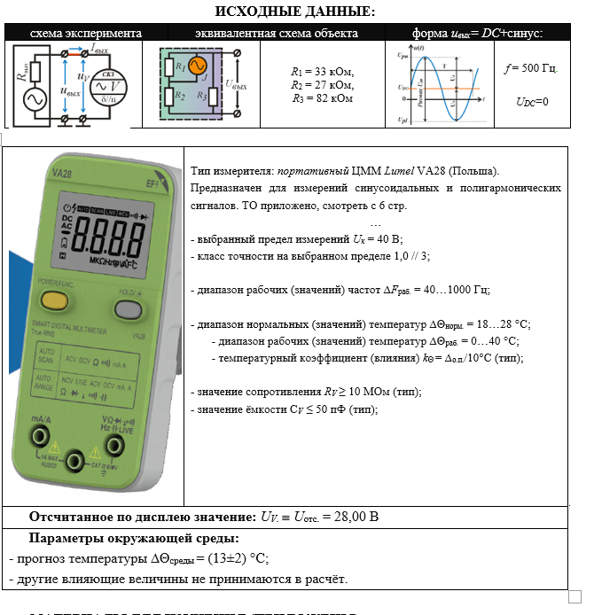 ИСХОДНЫЕ ДАННЫЕ: схема экспериментаэквивалентная схема объектаформа uвых= DC+синус: R1 = 33 кОм, R2 = 27 кОм, R3 = 82 кОм f = 500 Гц. UDC=0 Тип измерителя: портативный ЦММ Lumel VA28 (Польша). Предназначен для измерений синусоидальных и полигармонических сигналов. ТО приложено, смотреть с 6 стр. … - выбранный предел измерений Uк = 40 В; - класс точности на выбранном пределе 1,0 // 3; - диапазон рабочих (значений) частот ∆Fраб. = 40…1000 Гц; - диапазон нормальных (значений) температур ∆Θнорм. = 18…28 °С; - диапазон рабочих (значений) температур ∆Θраб. = 0…40 °С; - температурный коэффициент (влияния) kΘ = ∆о.п./10°С (тип); - значение сопротивления RV ≥ 10 МОм (тип); - значение ёмкости СV ≤ 50 пФ (тип); Отсчитанное по дисплею значение: UV.