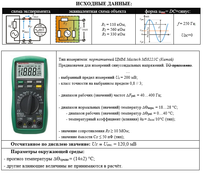 ИСХОДНЫЕ ДАННЫЕ: схема экспериментаэквивалентная схема объектаформа uвых= DC+синус: R1 = 270 кОм, R2 = 110 кОм, R3 = 470 кОм f = 500 Гц. UDC=0 Тип измерителя: портативный ЦММ Sanwa PM7a (Япония). Предназначен для измерений синусоидальных напряжений без постоянной составляющей. ТО приложено, смотреть 14-15 стр. … - выбранный предел измерений Uк = 4 В; - класс точности на выбранном пределе 2,3 // 10; - диапазон рабочих (значений) частот ∆Fраб. = 40…400 Гц; - диапазон нормальных (значений) температур ∆Θнорм. = 18…28 °С; - диапазон рабочих (значений) температур ∆Θраб. = 5…40 °С; - температурный коэффициент (влияния) kΘ = ∆о.п./10°С (тип); - значение сопротивления RV ≥ 10 МОм; - значение ёмкости СV ≤ 50 пФ (тип); Отсчитанное по дисплею значение: UV.