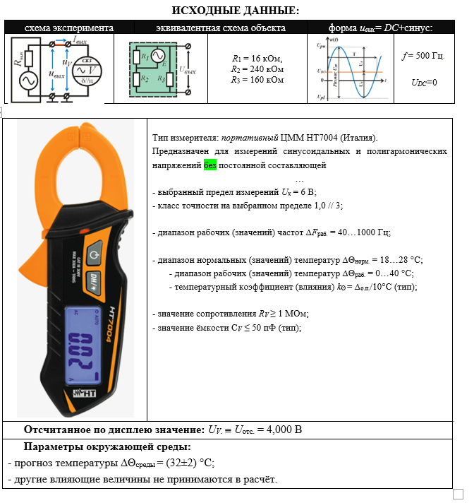 ИСХОДНЫЕ ДАННЫЕ: схема экспериментаэквивалентная схема объектаформа uвых= DC+синус: R1 = 16 кОм, R2 = 240 кОм R3 = 160 кОм f = 500 Гц. UDC=0 Тип измерителя: портативный ЦММ HT7004 (Италия). Предназначен для измерений синусоидальных и полигармонических напряжений без постоянной составляющей … - выбранный предел измерений Uк = 6 В; - класс точности на выбранном пределе 1,0 // 3; - диапазон рабочих (значений) частот ∆Fраб. = 40…1000 Гц; - диапазон нормальных (значений) температур ∆Θнорм. = 18…28 °С; - диапазон рабочих (значений) температур ∆Θраб. = 0…40 °С; - температурный коэффициент (влияния) kΘ = ∆о.п./10°С (тип); - значение сопротивления RV ≥ 1 МОм; - значение ёмкости СV ≤ 50 пФ (тип); Отсчитанное по дисплею значение: UV.