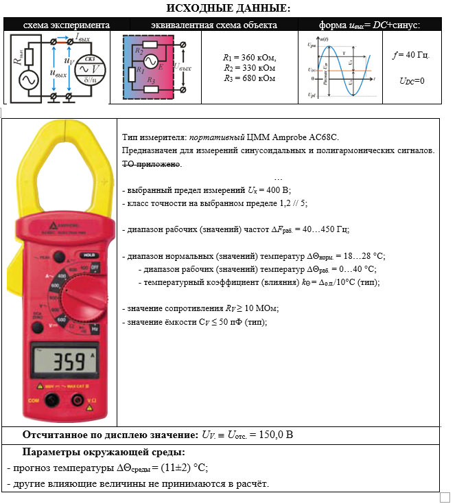 ИСХОДНЫЕ ДАННЫЕ: схема экспериментаэквивалентная схема объектаформа uвых= DC+синус: R1 = 360 кОм, R2 = 330 кОм R3 = 680 кОм f = 40 Гц. UDC=0 Тип измерителя: портативный ЦММ Amprobe AC68C. Предназначен для измерений синусоидальных и полигармонических сигналов. ТО приложено. … - выбранный предел измерений Uк = 400 В; - класс точности на выбранном пределе 1,2 // 5; - диапазон рабочих (значений) частот ∆Fраб. = 40…450 Гц; - диапазон нормальных (значений) температур ∆Θнорм. = 18…28 °С; - диапазон рабочих (значений) температур ∆Θраб. = 0…40 °С; - температурный коэффициент (влияния) kΘ = ∆о.п./10°С (тип); - значение сопротивления RV ≥ 10 МОм; - значение ёмкости СV ≤ 50 пФ (тип); Отсчитанное по дисплею значение: UV.