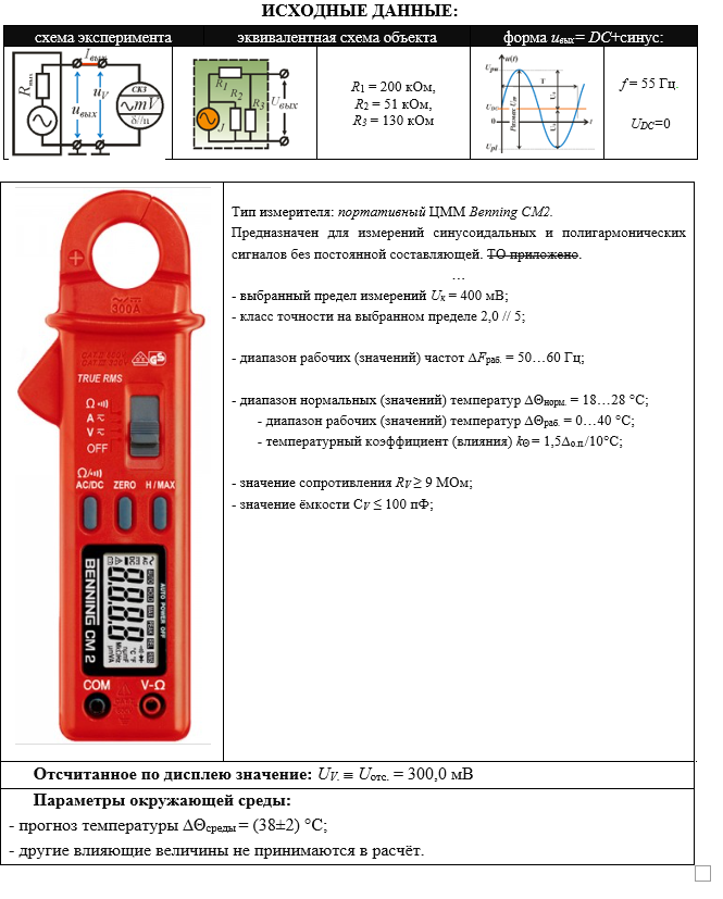 ИСХОДНЫЕ ДАННЫЕ: схема экспериментаэквивалентная схема объектаформа uвых= DC+синус: R1 = 200 кОм, R2 = 51 кОм, R3 = 130 кОм f = 55 Гц. UDC=0 Тип измерителя: портативный ЦММ Benning CM2. Предназначен для измерений синусоидальных и полигармонических сигналов без постоянной составляющей. ТО приложено. … - выбранный предел измерений Uк = 400 мВ; - класс точности на выбранном пределе 2,0 // 5; - диапазон рабочих (значений) частот ∆Fраб. = 50…60 Гц; - диапазон нормальных (значений) температур ∆Θнорм. = 18…28 °С; - диапазон рабочих (значений) температур ∆Θраб. = 0…40 °С; - температурный коэффициент (влияния) kΘ = 1,5∆о.п./10°С; - значение сопротивления RV ≥ 9 МОм; - значение ёмкости СV ≤ 100 пФ; Отсчитанное по дисплею значение: UV.