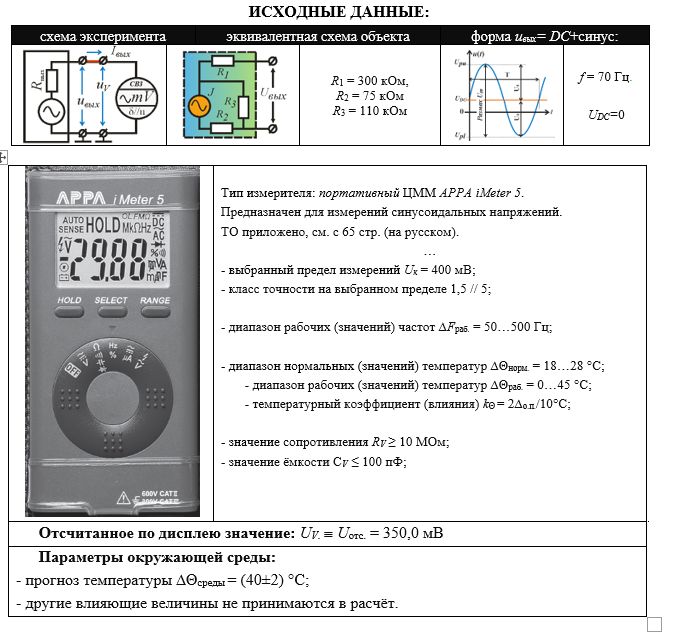 ИСХОДНЫЕ ДАННЫЕ: схема экспериментаэквивалентная схема объектаформа uвых= DC+синус: R1 = 300 кОм, R2 = 75 кОм R3 = 110 кОм f = 70 Гц. UDC=0 Тип измерителя: портативный ЦММ APPA iMeter 5. Предназначен для измерений синусоидальных напряжений. ТО приложено, см. с 65 стр. (на русском). … - выбранный предел измерений Uк = 400 мВ; - класс точности на выбранном пределе 1,5 // 5; - диапазон рабочих (значений) частот ∆Fраб. = 50…500 Гц; - диапазон нормальных (значений) температур ∆Θнорм. = 18…28 °С; - диапазон рабочих (значений) температур ∆Θраб. = 0…45 °С; - температурный коэффициент (влияния) kΘ = 2∆о.п./10°С; - значение сопротивления RV ≥ 10 МОм; - значение ёмкости СV ≤ 100 пФ; Отсчитанное по дисплею значение: UV.