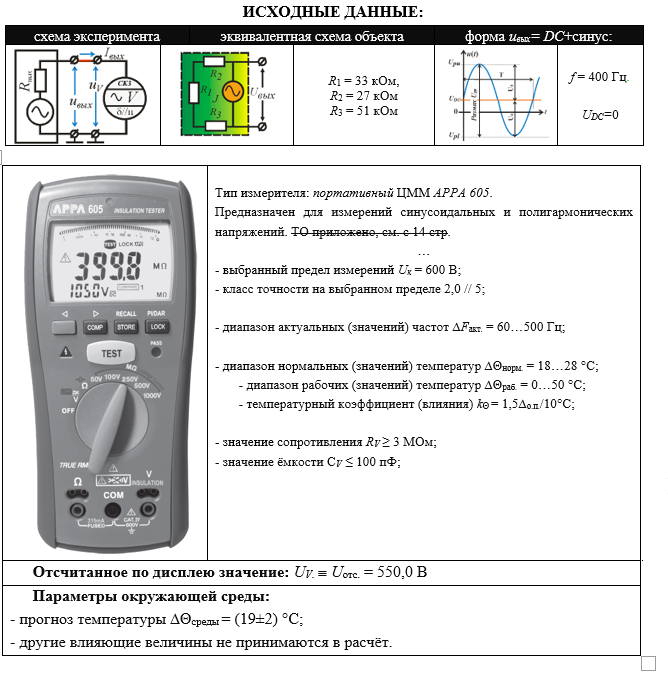 ИСХОДНЫЕ ДАННЫЕ: схема экспериментаэквивалентная схема объектаформа uвых= DC+синус: R1 = 33 кОм, R2 = 27 кОм R3 = 51 кОм f = 400 Гц. UDC=0 Тип измерителя: портативный ЦММ APPA 605. Предназначен для измерений синусоидальных и полигармонических напряжений. ТО приложено, см. с 14 стр. … - выбранный предел измерений Uк = 600 В; - класс точности на выбранном пределе 2,0 // 5; - диапазон актуальных (значений) частот ∆Fакт. = 60…500 Гц; - диапазон нормальных (значений) температур ∆Θнорм. = 18…28 °С; - диапазон рабочих (значений) температур ∆Θраб. = 0…50 °С; - температурный коэффициент (влияния) kΘ = 1,5∆о.п./10°С; - значение сопротивления RV ≥ 3 МОм; - значение ёмкости СV ≤ 100 пФ; Отсчитанное по дисплею значение: UV.