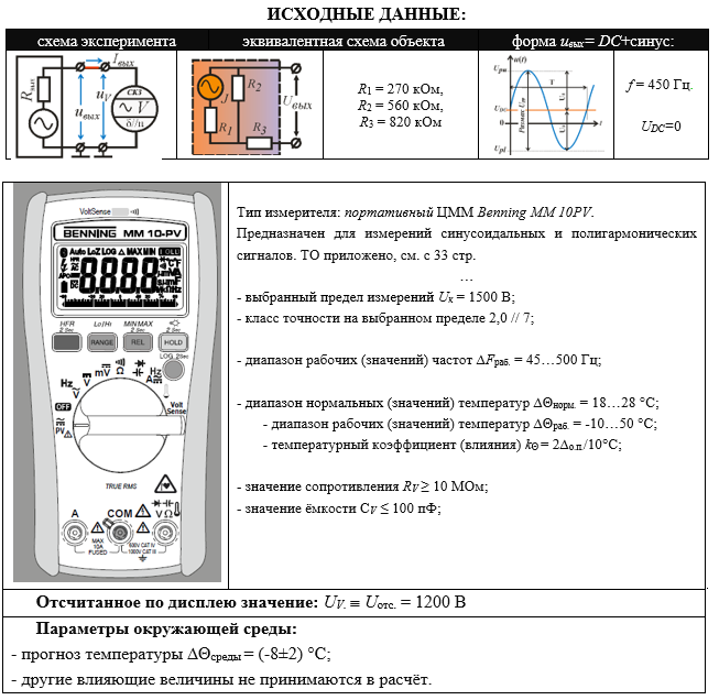 ИСХОДНЫЕ ДАННЫЕ: схема экспериментаэквивалентная схема объектаформа uвых= DC+синус: R1 = 270 кОм, R2 = 560 кОм, R3 = 820 кОм f = 450 Гц. UDC=0 Тип измерителя: портативный ЦММ Benning MM 10PV. Предназначен для измерений синусоидальных и полигармонических сигналов. ТО приложено, см. с 33 стр. … - выбранный предел измерений Uк = 1500 В; - класс точности на выбранном пределе 2,0 // 7; - диапазон рабочих (значений) частот ∆Fраб. = 45…500 Гц; - диапазон нормальных (значений) температур ∆Θнорм. = 18…28 °С; - диапазон рабочих (значений) температур ∆Θраб. = -10…50 °С; - температурный коэффициент (влияния) kΘ = 2∆о.п./10°С; - значение сопротивления RV ≥ 10 МОм; - значение ёмкости СV ≤ 100 пФ; Отсчитанное по дисплею значение: UV.