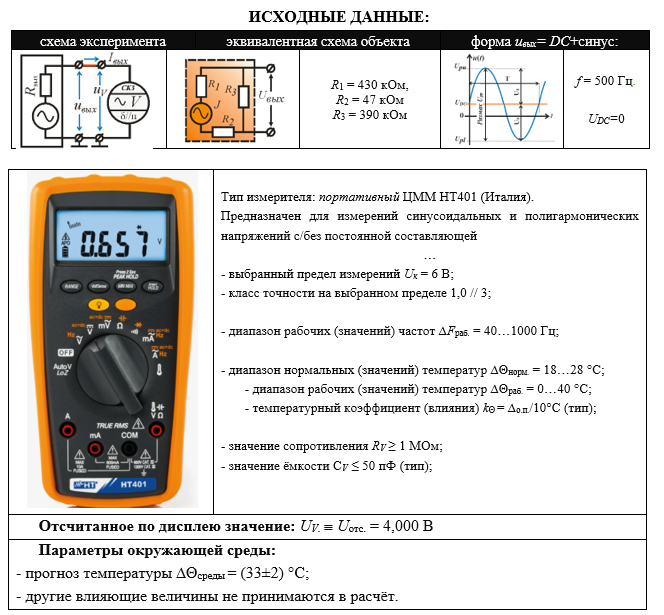 ИСХОДНЫЕ ДАННЫЕ: схема экспериментаэквивалентная схема объектаформа uвых= DC+синус: R1 = 430 кОм, R2 = 47 кОм R3 = 390 кОм f = 500 Гц. UDC=0 Тип измерителя: портативный ЦММ HT401 (Италия). Предназначен для измерений синусоидальных и полигармонических напряжений c/без постоянной составляющей … - выбранный предел измерений Uк = 6 В; - класс точности на выбранном пределе 1,0 // 3; - диапазон рабочих (значений) частот ∆Fраб. = 40…1000 Гц; - диапазон нормальных (значений) температур ∆Θнорм. = 18…28 °С; - диапазон рабочих (значений) температур ∆Θраб. = 0…40 °С; - температурный коэффициент (влияния) kΘ = ∆о.п./10°С (тип); - значение сопротивления RV ≥ 1 МОм; - значение ёмкости СV ≤ 50 пФ (тип); Отсчитанное по дисплею значение: UV.