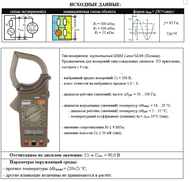 ИСХОДНЫЕ ДАННЫЕ: схема экспериментаэквивалентная схема объектаформа uвых= DC+синус: R1 = 300 кОм, R2 = 430 кОм, R3 = 51 кОм f = 85 Гц. UDC=0 Тип измерителя: портативный ЦММ Lumel M266 (Польша). Предназначен для измерений синусоидальных сигналов. ТО приложено, смотреть с 9 стр. … - выбранный предел измерений Uк = 200 В; - класс точности на выбранном пределе 1,0 // 4; - диапазон рабочих (значений) частот ∆Fраб. = 50…500 Гц; - диапазон нормальных (значений) температур ∆Θнорм. = 18…28 °С; - диапазон рабочих (значений) температур ∆Θраб. = 5…35 °С; - температурный коэффициент (влияния) kΘ = ∆о.п./10°С (тип); - значение сопротивления RV ≥ 9 МОм; - значение ёмкости СV ≤ 50 пФ (тип); Отсчитанное по дисплею значение: UV.