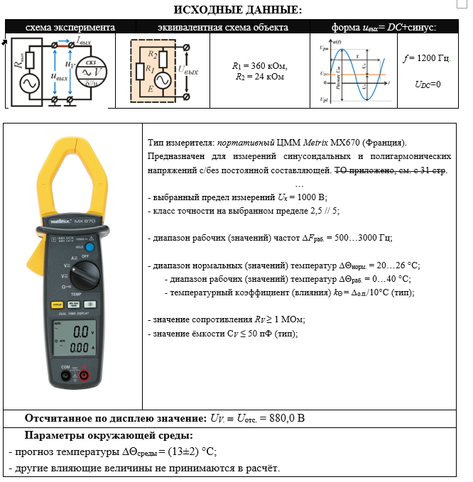 ИСХОДНЫЕ ДАННЫЕ: схема экспериментаэквивалентная схема объектаформа uвых= DC+синус: R1 = 360 кОм, R2 = 24 кОм f = 1200 Гц. UDC=0 Тип измерителя: портативный ЦММ Metrix MX670 (Франция). Предназначен для измерений синусоидальных и полигармонических напряжений c/без постоянной составляющей. ТО приложено, см. с 31 стр. … - выбранный предел измерений Uк = 1000 В; - класс точности на выбранном пределе 2,5 // 5; - диапазон рабочих (значений) частот ∆Fраб. = 500…3000 Гц; - диапазон нормальных (значений) температур ∆Θнорм. = 20…26 °С; - диапазон рабочих (значений) температур ∆Θраб. = 0…40 °С; - температурный коэффициент (влияния) kΘ = ∆о.п./10°С (тип); - значение сопротивления RV ≥ 1 МОм; - значение ёмкости СV ≤ 50 пФ (тип); Отсчитанное по дисплею значение: UV.